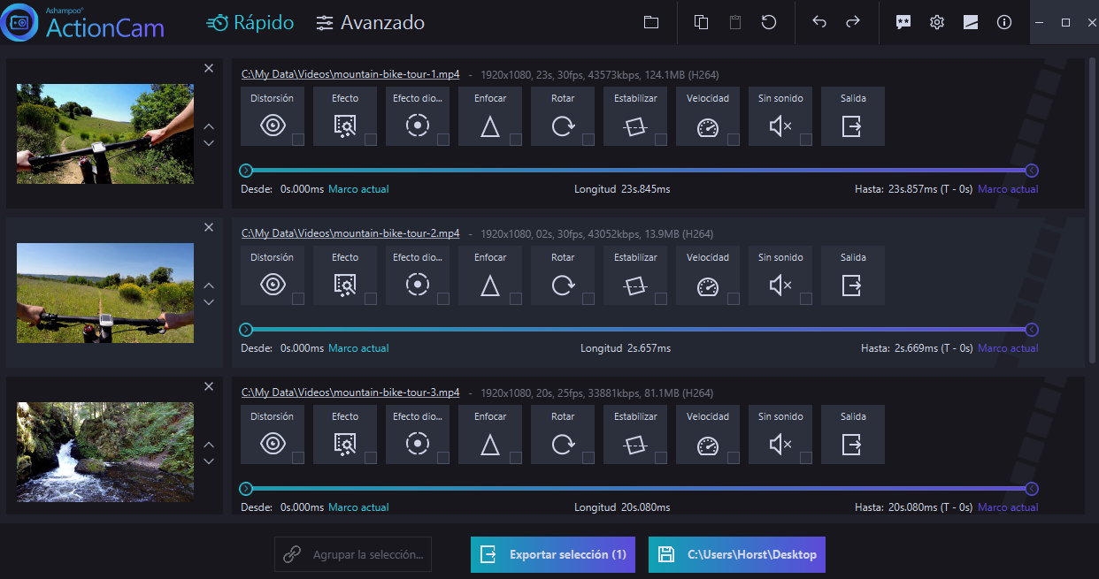 Los disparos rápidos y basados en drones a menudo carecen de nitidez. Ashampoo ActionCam presenta un enfoque altamente eficiente para eliminar las calimas y la niebla. ¡Y el procesamiento por lotes incorporado le ayuda a trabajar aún más rápido al procesar múltiples clips de una sola vez!